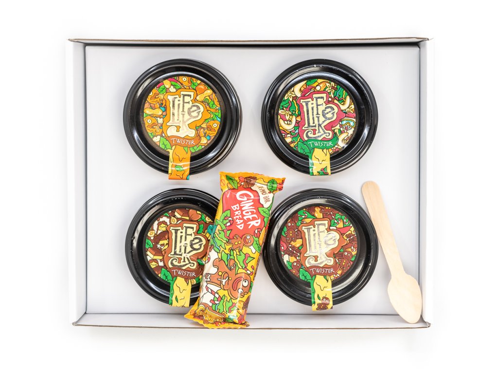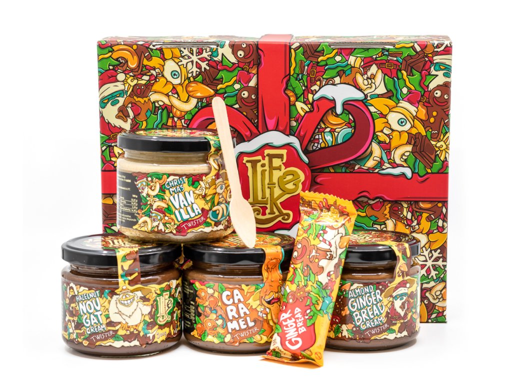 Dárková krabička LifeLike obsahuje vybrané oříškové krémy, tyčinku a lžičku: