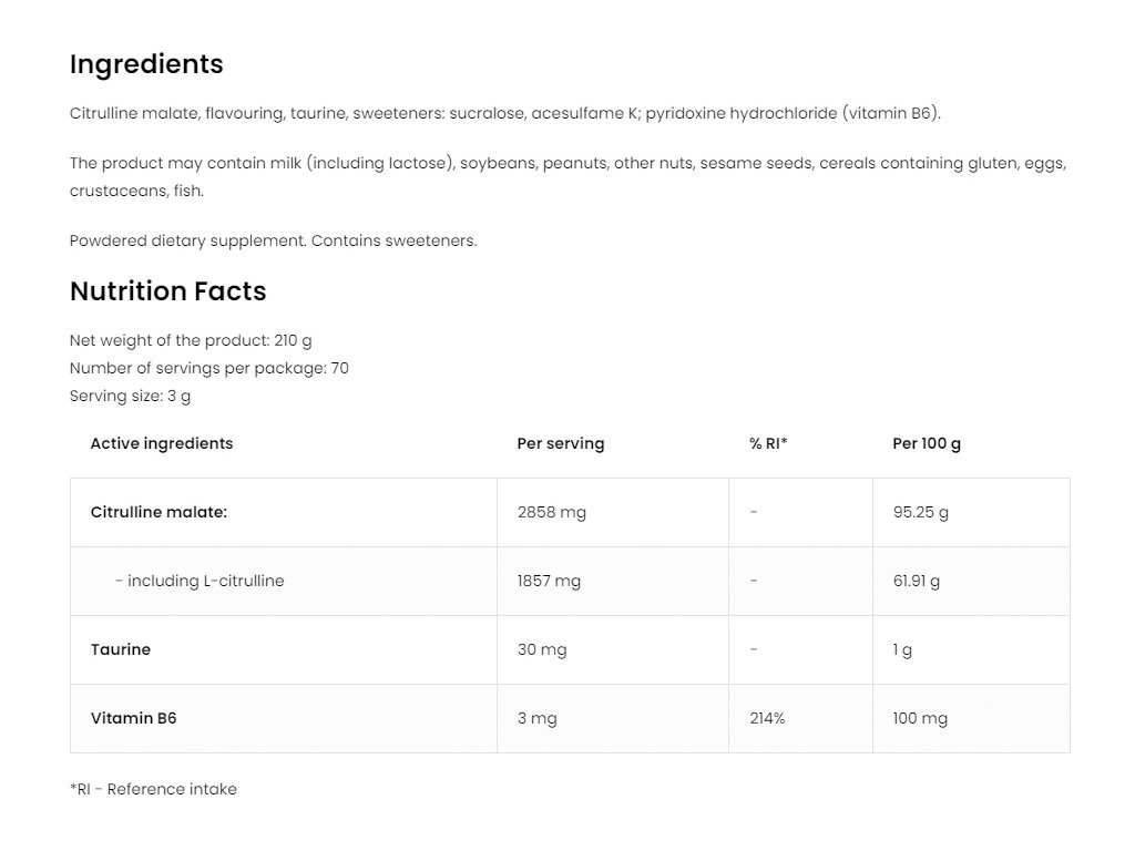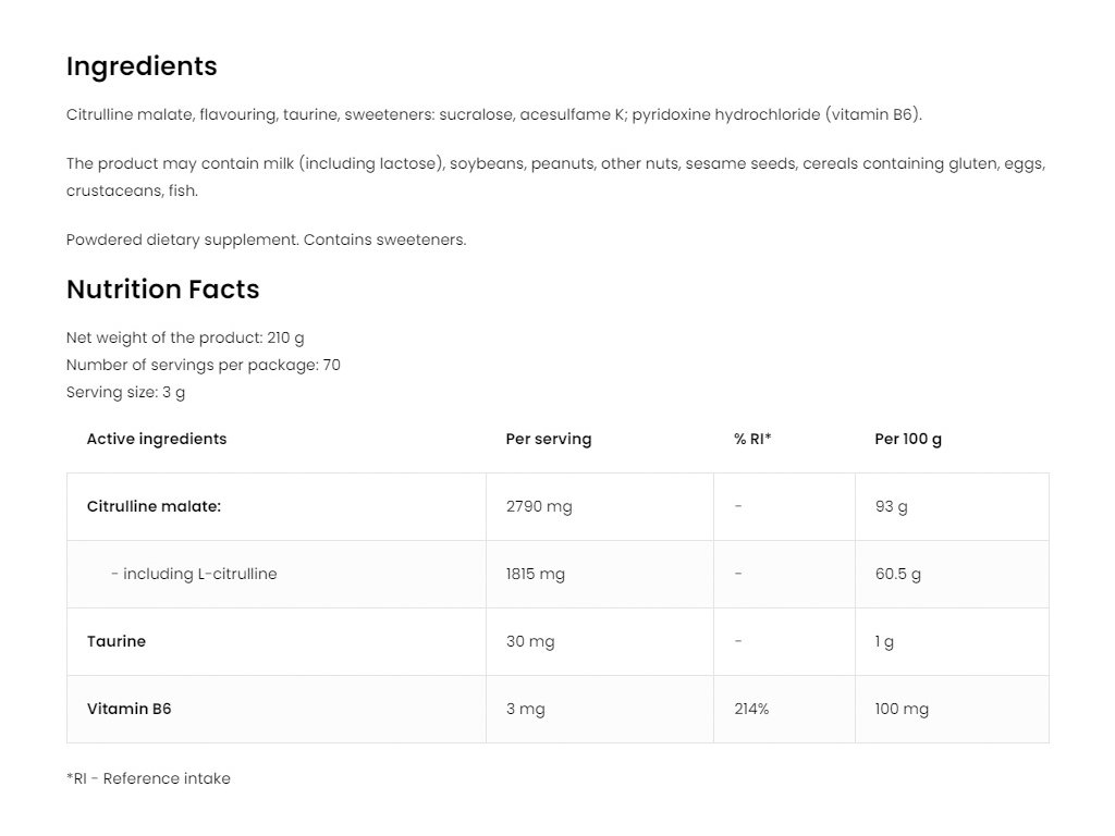 - Zdroj citrulinu - jedna porce doplňku stravy dodává tělu 2790 mg L-citrulin malátu
