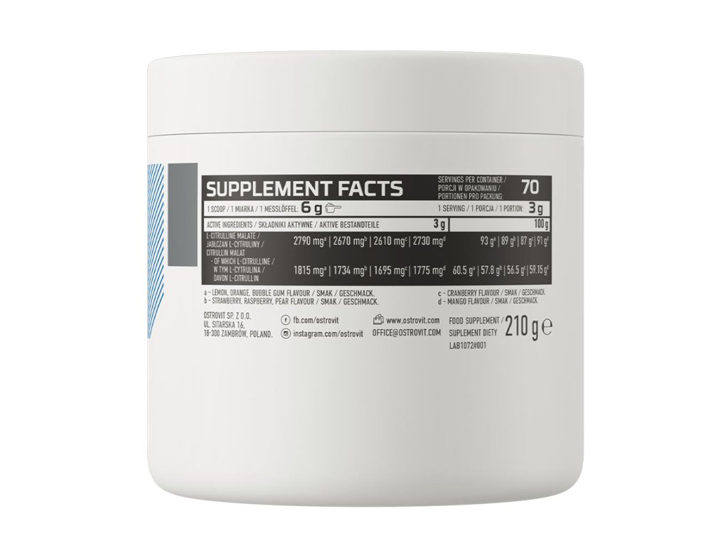 OstroVit používá citrulin malát, tj. forma sloučeniny, která se vyznačuje vynikající biologickou dostupností a ergogenitou, což má pozitivní vliv na kvalitu přípravku a účinnost suplementace