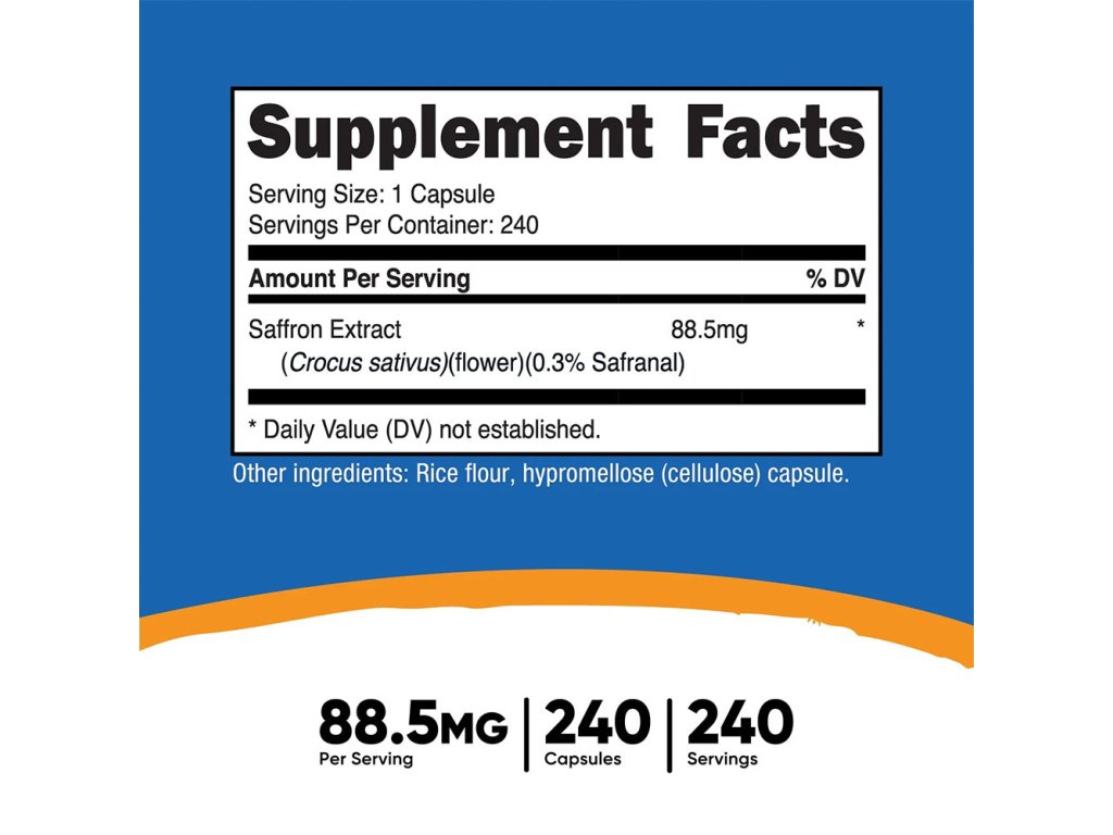 88.5 mg šafránu v jedné porci240 vegetariánských kapslí v lahvičce pro 240 porcí (pouze 1 kapsle na jednu porci)zásoba na 8 měsíců (pokud se užívá podle pokynů)Vegetariánské, bezlepkové, bez sóji a bez GMOVyrobeno v souladu s GMP, registrováno FDA