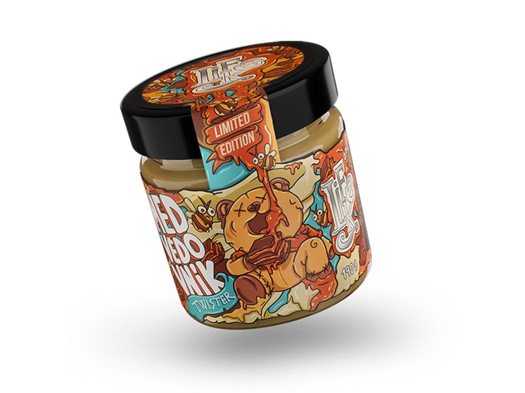 Twister Medvědovník je poctivá směs mandlí a vlašských ořechů doplněná karamelovou čokoládou, medem a špetkou perníkového koření. Výsledek? Krém, který voní po karamelu, skořici a hřejivém pohodlí – jako první sousto dezertu, který znáš z dětství.