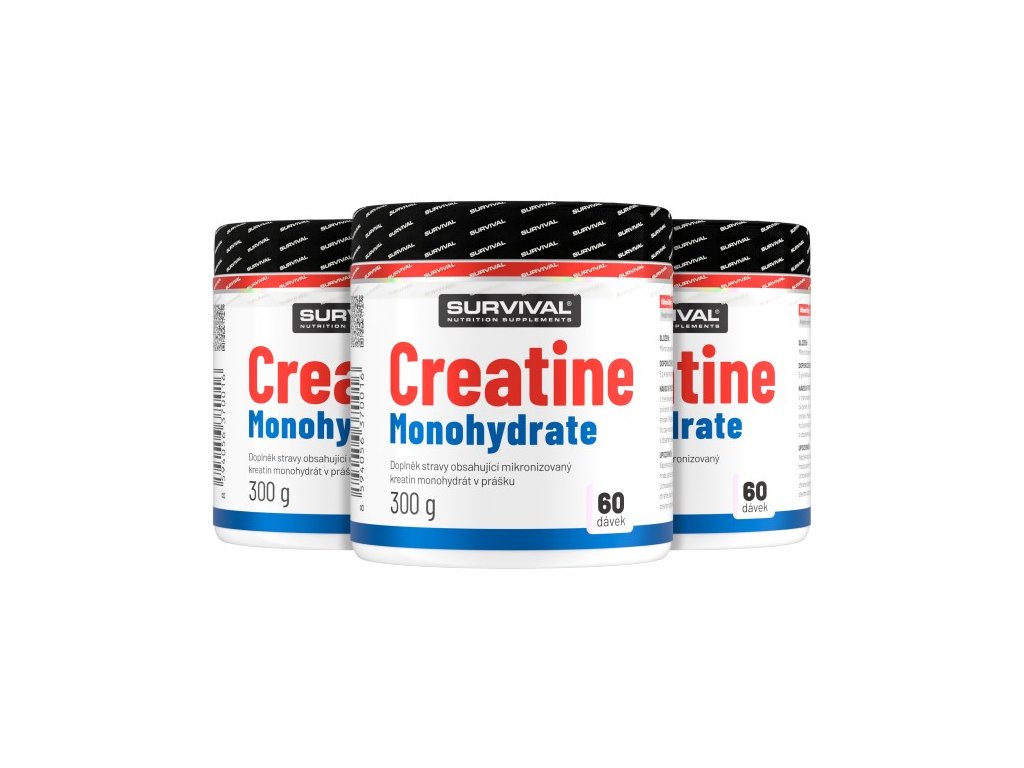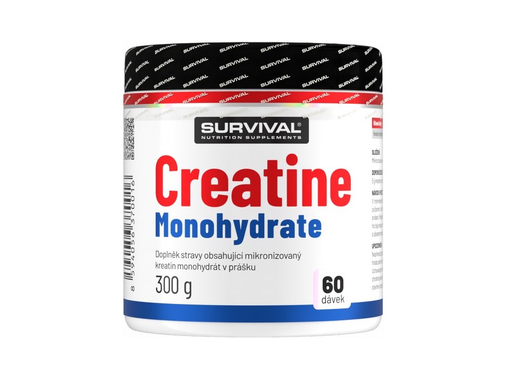Kreatin zvyšuje fyzickou výkonnost při po sobě jdoucích krátkodobých intervalech vysoce intenzivního fyzického výkonu, příznivého účinku se dosáhne při dávkování od 3 g kreatinu denně. Creatine Monohydrate značky Survival je vysoce čistou mikronizovanou formou kreatinu monohydrátu bez obsahu jakýchkoliv jiných přísad. Mikronizovaná forma umožní snadnou přípravu, rychlou rozpustnost a maximální využitelnost v lidském organismu.