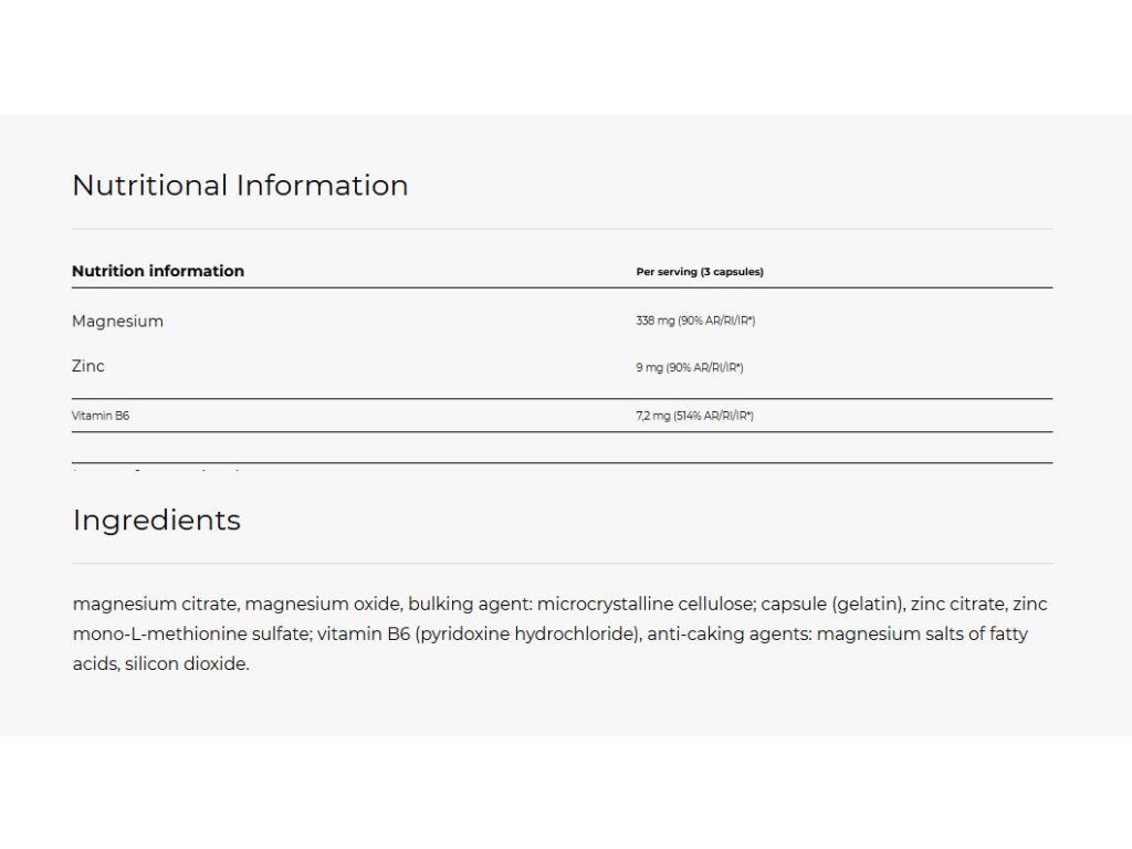 - Podpora noční regenerace - kombinace zinku, hořčíku a vitaminu B6 usnadňuje svalovou relaxaci a produkci anabolických hormonů: během spánku tělo regeneruje a opravuje svalovou tkáň poškozenou během fyzické aktivity;