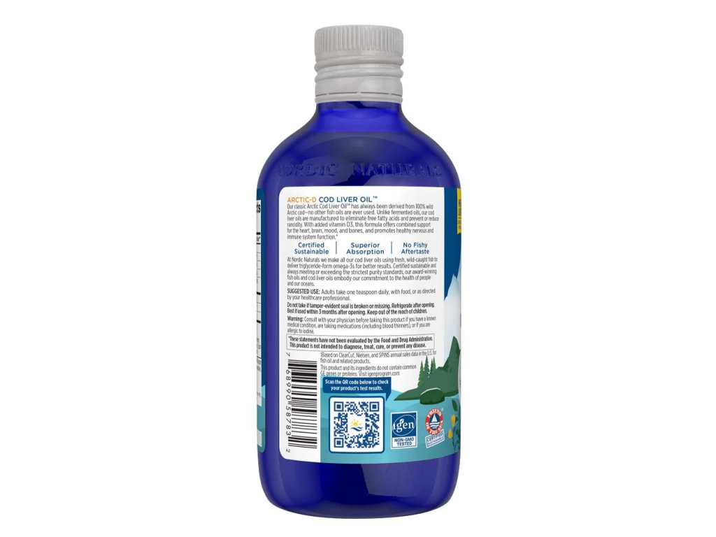 Udržitelně získáváno v Norsku, Arctic-D Cod Liver Oil™ obsahuje naši oceňovanou recepturu oleje z tresčích jater s 25 mcg (1000 IU) přidaného přírodního vitamínu D3.1060 mg celkových omega-3; 25 mcg (1000 IU) vitamínu D3Vyrobeno výhradně ze 100% voln…