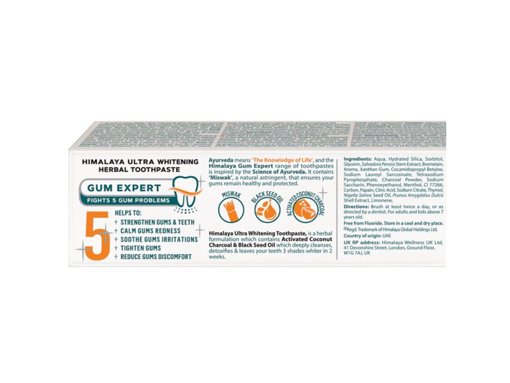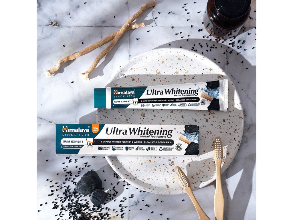 Ájurvéda znamená "věda o životě". Himalaya uplatňuje zásady ájurvédy při vývoji svých zubních past Gum Expert, které obsahují miswak, přírodní adstringent, který pomáhá udržovat a chránit zdravé dásně.Tato bylinná receptura obohacená o aktivní kokosové uhlí a olej z černých semínek nabízí detoxikační a čisticí účinky, jejichž výsledkem jsou až o 3 odstíny bělejší zuby za pouhé dva týdny.