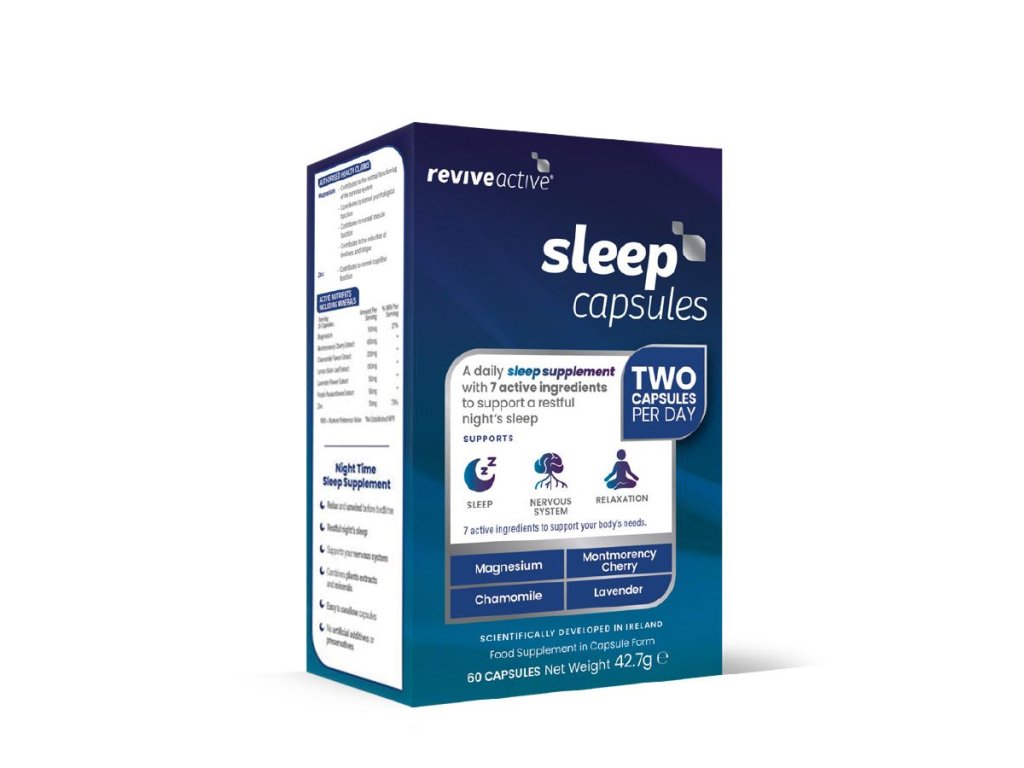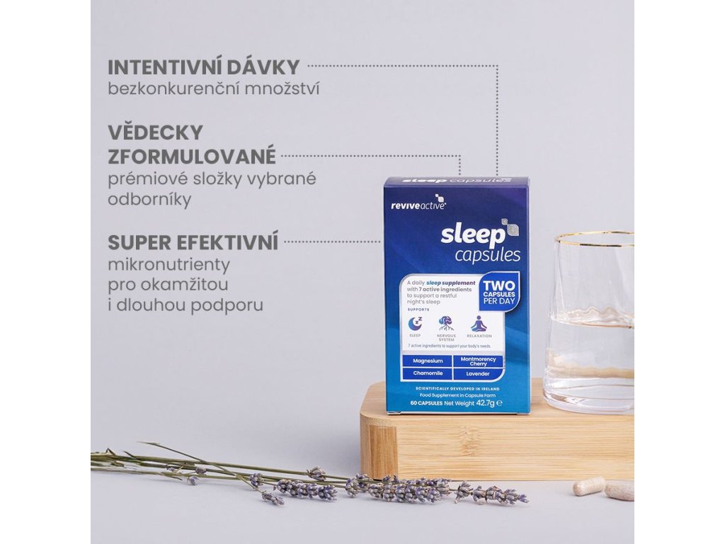 Sleep je ve své kategorii ultimátní doplněk stravy, který má okamžitý i dlouhodobý účinek. Produkt je sestavený speciálně pro jedince, kteří mají problémy se spánkem v krátkodobém i dlouhodobém horizontu. Podporuje klidný spánek, spánkový rytmus i nervovou soustavu. Třešeň Montmorency je přirozeným zdrojem melatoninu, který má vlastnosti související s cirkadiánním rytmem. Všech sedm obsažených složek pak má podobné účinky související s nervovou soustavou. Na rozdíl od konvenčních léků na těchto složkách nevzniká návyk. To vše bez obsahu nežádoucích a balastních aditiv v každé kapsli! V případě nadměrné stresové zátěže a psychického vypětí je možné Revive Active Sleep kombinovat s produktem Revive Active Calm, který je určen pro zvládání stresu a nervozity během dne.