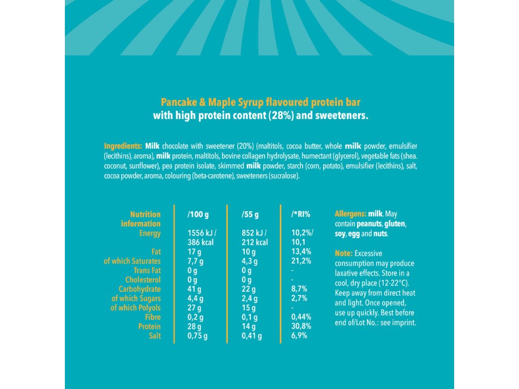 Snídaňová nálada kdykoli! Nadýchaná příchuť palačinek s kapkou javorové sladkosti a navíc 14 g bílkovin pro energii na celý den