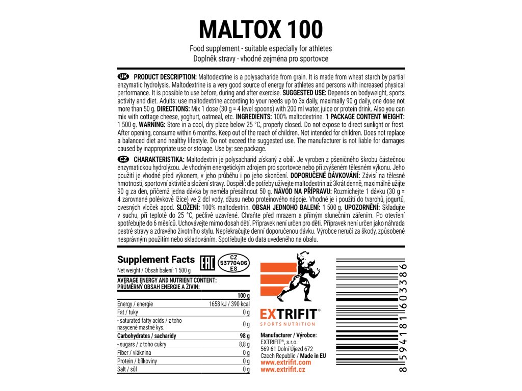 Maltodextrin je polysacharid získaný z obilí. Je vyroben z pšeničného škrobu částečnou enzymatickou hydrolýzou. Vzniká spojením pěti molekul glukózy – jednoduchého cukru sloužícího jako hlavní zdroj energie pro naše tělo. Výhodou tohoto spojení je možnost pozvolnějšího uvolňování glukózy jako zdroje energie. Maltodextrin se postupně štěpí v našem střevě na jednotlivé molekuly glukózy. Ty se pak plynule vstřebávají a zajišťují stabilní zvýšení hladiny krevního cukru (glykémie). Rychlé výkyvy hladiny krevního cukru způsobené jednorázovým příjmem většího množství jednoduchého cukru vedou ke střídání pocitu sytosti a hladu. Pro sportovce není takový způsob hrazení energie optimální. Dobrého efektu se docílí právě spojením několika molekul glukózy do krátkého řetězce – maltodextrinu. Jeho použití je vhodné před výkonem, v jeho průběhu i po jeho skončení.