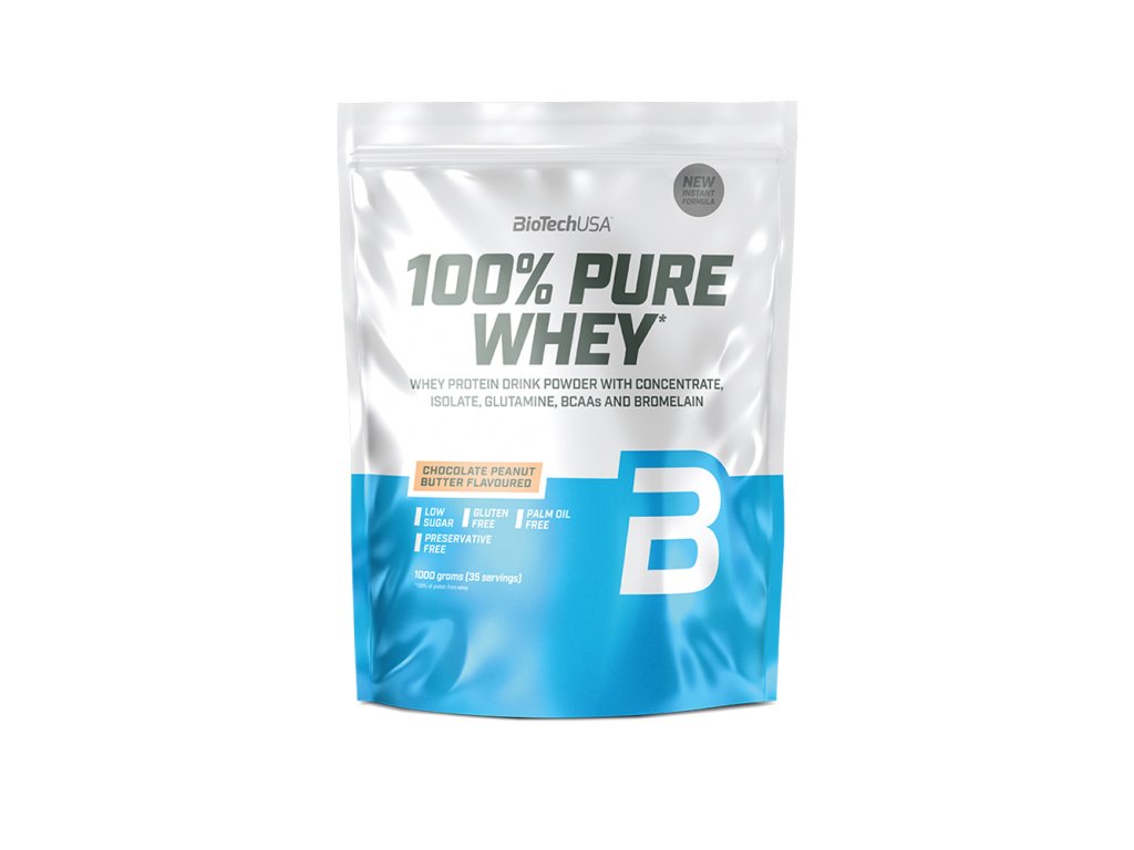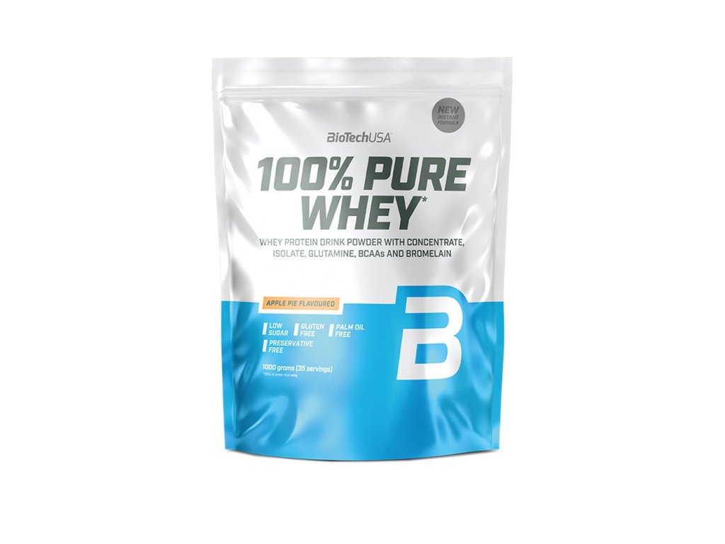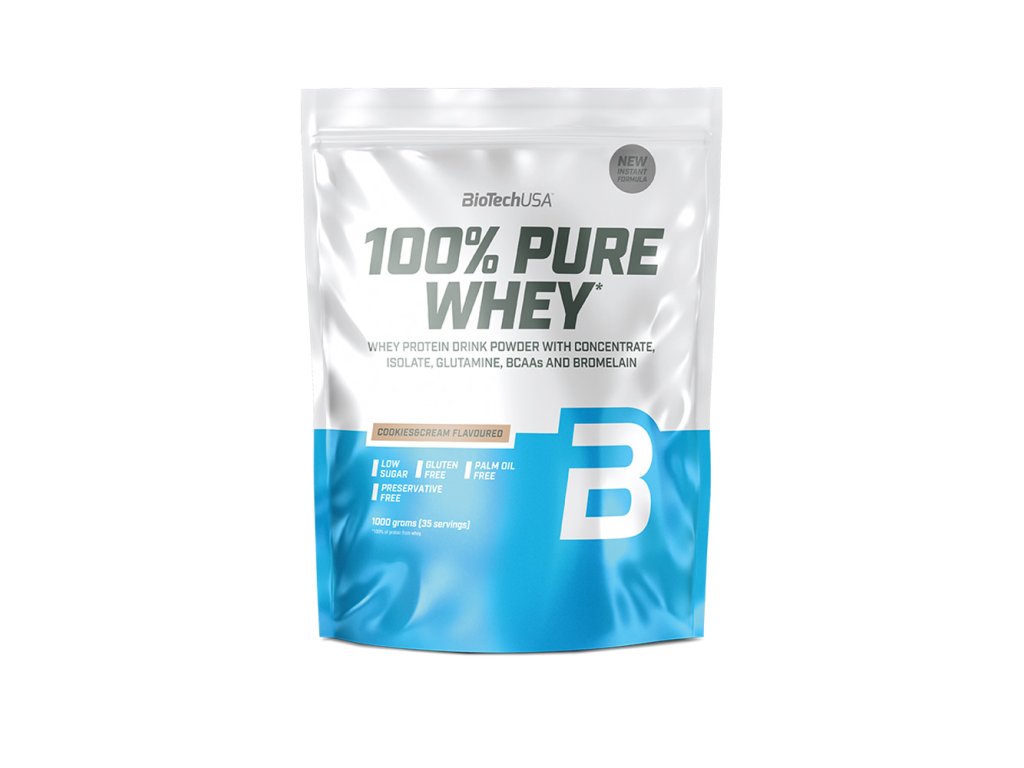 100% Pure Whey je vysoce kvalitní proteinový prášek s vysokou biologickou hodnotou. Je kombinací syrovátkového koncentrátu, syrovátkového izolátu a přidaných aminokyselin (L-glutamin, L-arginin a BCAA). Díky nízkému obsahu sacharidů a tuků je vhodný i v dietní fázi. Neobsahuje lepek ani palmový olej. K dostání je v pestré škále příchutí.