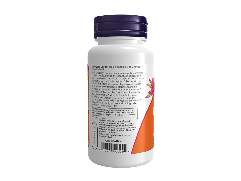 NOW kombinuje dvě živiny, jejichž přínos pro zdraví kostí, zubů a kardiovaskulárního systému je předmětem rozsáhlého výzkumu. Vitamin D3 podporuje transport a vstřebávání vápníku. Nedávné studie naznačují, že vitamin D3 může hrát roli ve správném působení inzulínu a metabolismu glukózy a má důležitou funkci v imunitním systému. Vitamin K je důležitý pro tvorbu zdravé a silné kostní matrix. Úloha vitaminu K pro zdraví tepen se odvíjí od jeho schopnosti podporovat správný metabolismus vápníku v cévních strukturách. Vitamin K2 je snadno aktivní a biologicky dostupná forma vitaminu K.