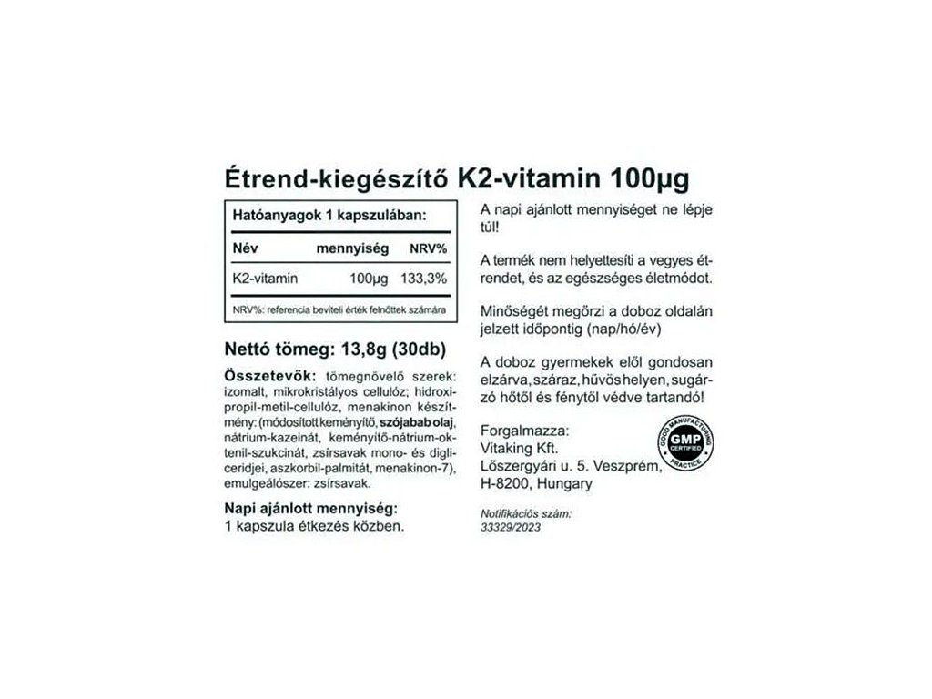 Vitaking K2 obsahuje 90 µg VITAMK7®. VITAMK7 ® je patentovaný all-trans vitamin K2 vyráběný přírodní fermentací.Upozornění