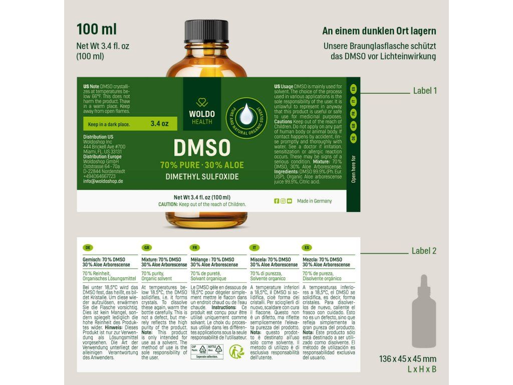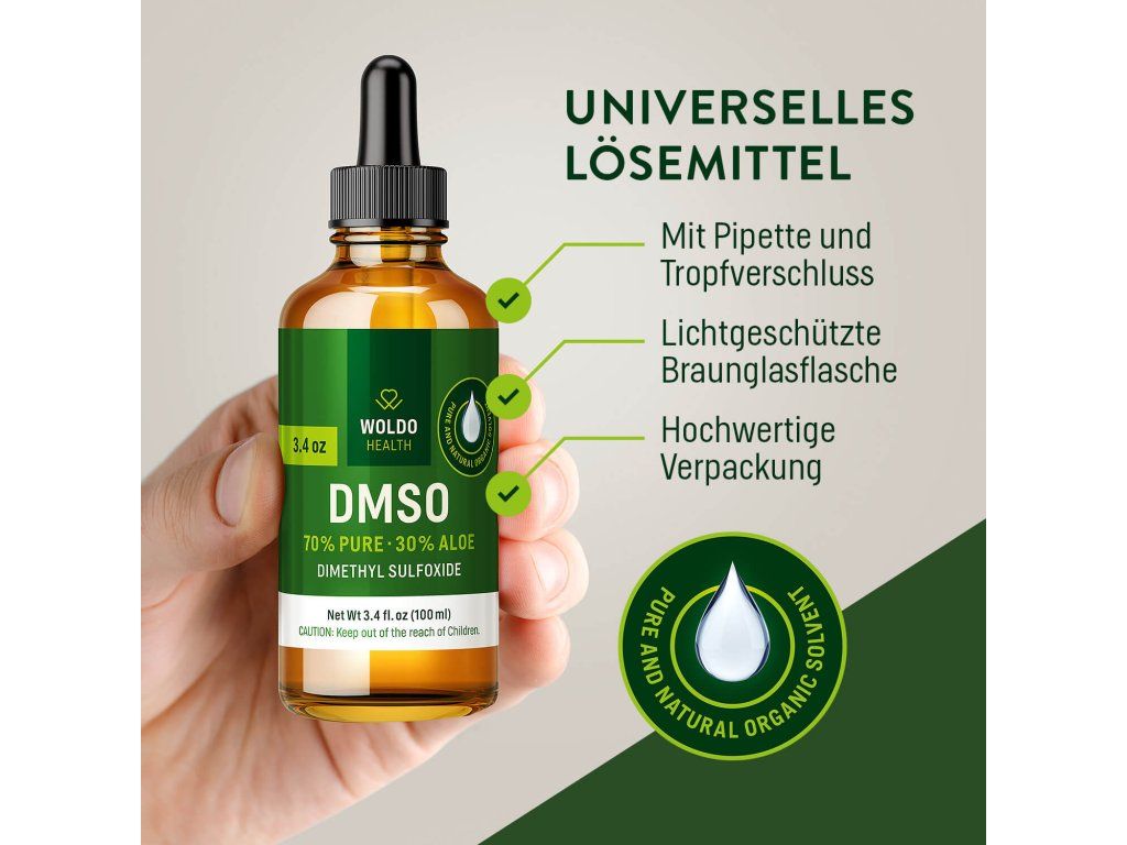 DMSO (dimethylsulfoxid) ve směsi s organickou šťávou z aloe vera v poměru 70:30 je čisté organické rozpouštědlo, které je vyhledáváno pro své výrazné transportní a rozpouštěcí vlastnosti.
