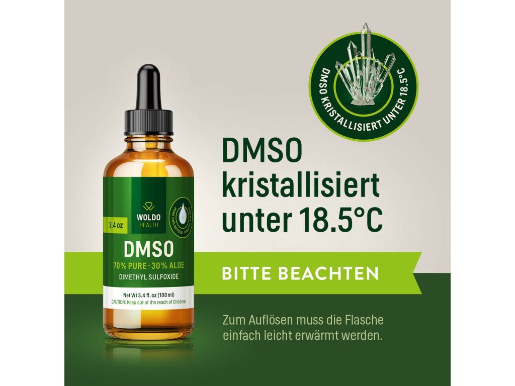 DMSO se přirozeně krystalizuje při teplotách pod 18,5 °C, což je jeho běžná vlastnost a nepředstavuje závadu produktu. Pro opětovné zkapalnění stačí lahvičku jemně zahřát na pokojovou teplotu.