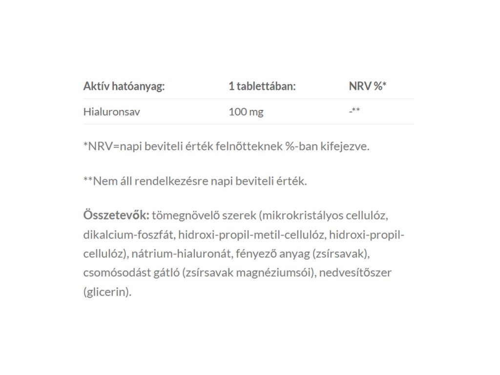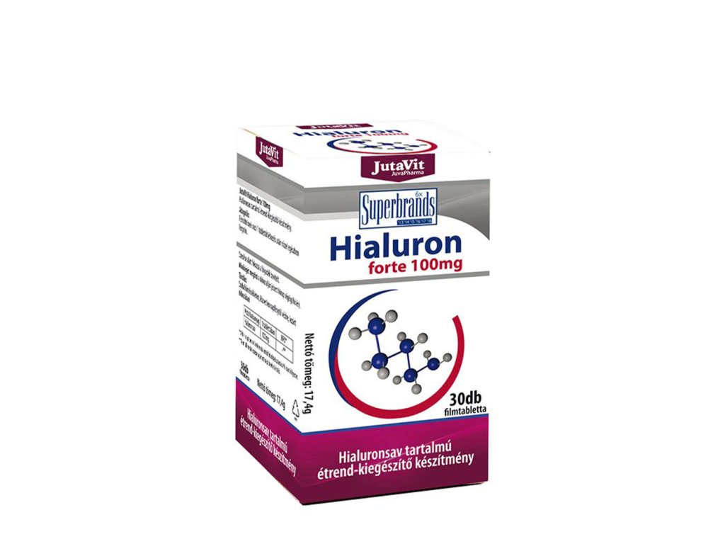 Kyselina hyaluronová je vysokomolekulární sacharid přirozeně se vyskytující v lidském těle, včetně oka, kožní tkáně, svalů a kloubů, s vysokou schopností vázat vodu. Jeho doplňkový příjem lze zajistit ve formě doplňku stravy. JutaVit kyselina hyaluronová forte tablety obsahují 100 mg kyseliny hyaluronové ve formě hyaluronátu sodného, čímž přispívají k doplnění množství kyseliny hyaluronové v těle.Upozornění