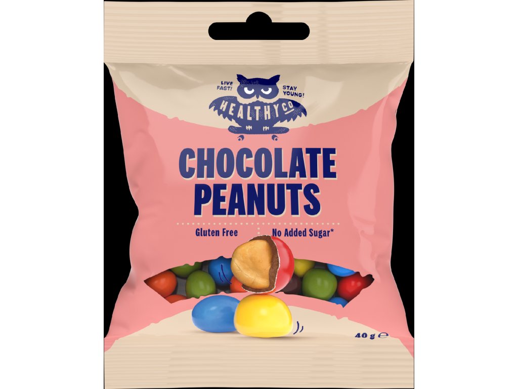 HealthyCo Arašídy v křupavém čokoládovém kabátku bez přidaného cukru. Slazené stévií. Bez lepku.