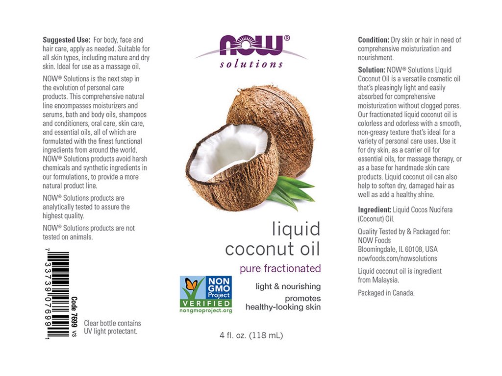 Řešení: Tekutý kokosový olej NOW® Solutionsje všestranný kosmetický olej, který je příjemně lehký a snadno se vstřebává pro komplexní hydrataci bez ucpaných pórů. Náš frakcionovaný tekutý kokosový olej je bezbarvý a bez zápachu, má hladkou nemastnou texturu, která je ideální pro nejrůznější použití v osobní péči. Používejte ho na suchou pokožku, jako nosný olej pro esenciální oleje, k masážím nebo jako základ pro ručně vyráběné produkty péče o pleť. Tekutý kokosový olej může také pomoci změkčit suché a poškozené vlasy a dodat jim zdravý lesk.